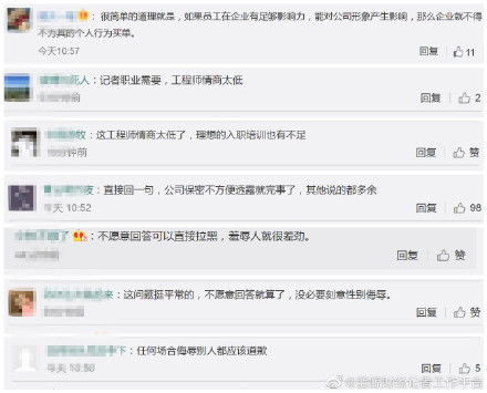 有网友评论,“记者职业需要,工程师情商太低”“理想的入职培训也有不足”“不愿意回答可以拉黑,侮辱人就很差劲”“任何场合侮辱别人都应该道歉”。也有网友评论称,“企业没必要替出事员工道歉,但是企业内部可以对所有员工培训如何处理这种情况。”对此,你怎么看? (中新经纬)