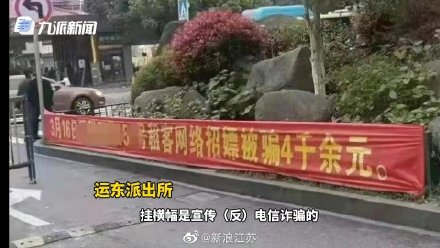 警方:想警示居民,已经撤掉】4月29日,江苏扬州。网曝派出所在一小区拉宣传横幅,称男子招嫖被骗12万。横幅写有受害人姓氏、所住小区、楼号等信息,有网友表示“这严重泄漏个人隐私”。29日,运东派出所民警回应称,此举是为提醒市民不要上当受骗。目前,条幅已撤掉,男子招嫖被骗案正在侦查中。