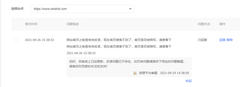 2021-04-26? 提交的 网站首页之前是有效收录,现在首页搜索不到了,首页是否被降权,请查看下,2021-04-29 14:38:05得到回复您好,目前线上已经更新,反馈问题已不存在,如仍有问题请提供下相应的问题截图,感谢您对百度的关注和支持!?