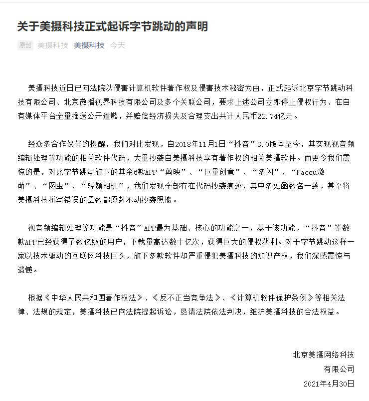 30 日消息 美摄科技通过其微信公众号发布声明,称近日已向法院以侵害计算机软件著作权及侵害技术秘密为由,正式起诉北京字节跳动科技有限公司、北京微播视界科技有限公司及多个关联公司,要求上述公司立即停止侵权行为、在自有媒体平台全量推送公开道歉,并赔偿经济损失及合理支出共计人民币 22.74 亿元。