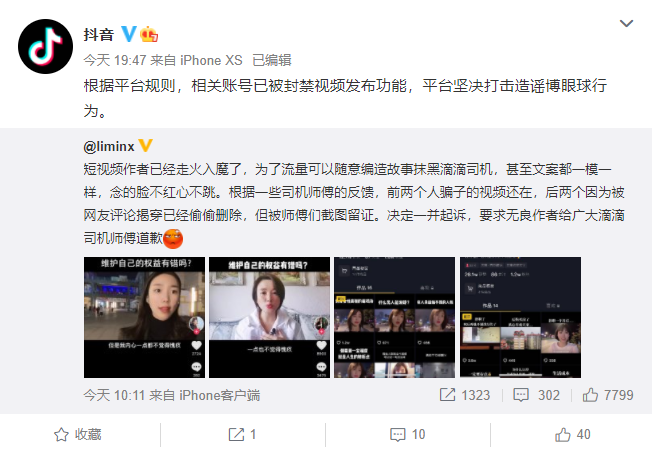 今天晚上,抖音官方微博回应称,根据平台规则,相关账号已被封禁视频发布功能,平台坚决打击造谣博眼球行为。