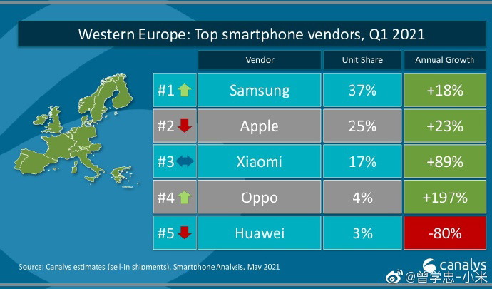 6 日消息 今日早间,小米集团副总裁、手机部总裁曾学忠发布微博表示,第一季度欧洲智能手机市场份额小米超过苹果,首次达到第二;西欧智能手机出货量增速迅猛,市场份额稳居第三;西班牙智能手机市场份额连续五个季度稳居第一。