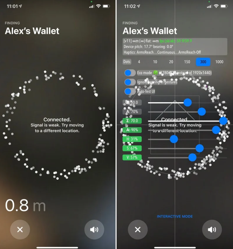 用户需使用支持 U1 芯片的 iPhone 11、iPhone 12 等设备,在精确查找界面点击物品名称 4 次,就可以打开一系列隐藏的控件,并显示加速度计和陀螺坐标、触觉反馈、屏幕分辨率、跟踪动画等等。