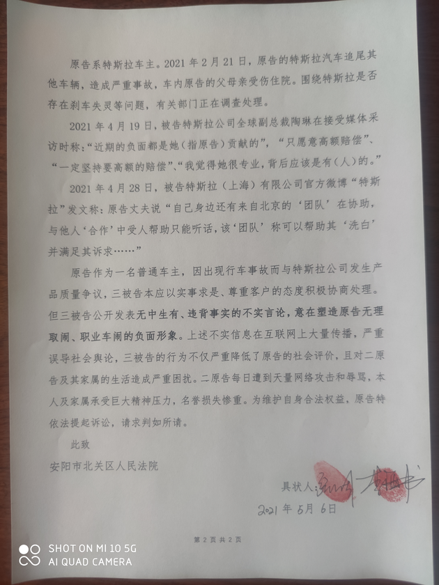 张女士在声明中称,在没有任何证据的情况下,特斯拉公司以及特斯拉对外事务副总裁陶琳发布的一些不实言论,已经对其个人以及家人的工作生活造成了严重的影响。为维护自己的合法权益,已于今日向安阳市北关区人民法院递交民事起诉状,要求依法追究相关人员的法律责任。