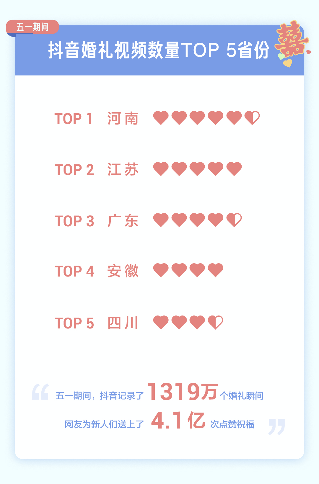 每逢节假日都是中国人结婚高峰期。今年五一,抖音记录了 1319 万个婚礼瞬间,网友为新人们送上了 4.1 亿次点赞祝福。其中,河南用户发布的婚礼视频最多,江苏、广东、安徽、四川紧随其后。