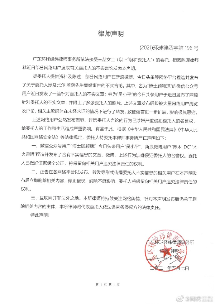 5 月 7 日深夜,王喆在微博公布了一份律师声明,声明称,有“博士顾琼颖”、“吴小平”等自媒体及头条用户发布涉及当事人的不实内容,律师事务所受王喆委托,提出三点诉求。