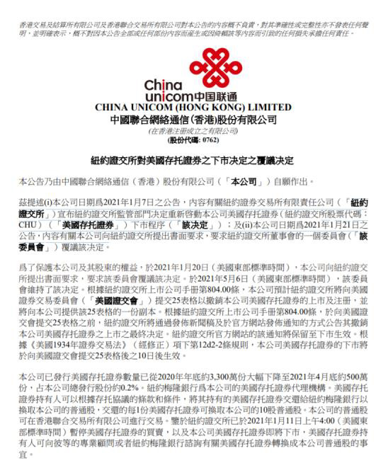 此前,美东时间 1 月 6 日,美国纽约证券交易所发布公告,称将重新推进中国移动、中国电信、中国联通退市。为了保护本公司及股东的合法权益,三大运营商分别于 1 月 20 日向纽约证交所提出书面要求,要求纽交所委员会复议该决定。2021 年 5 月 6 日,该委员会维持了该决定。