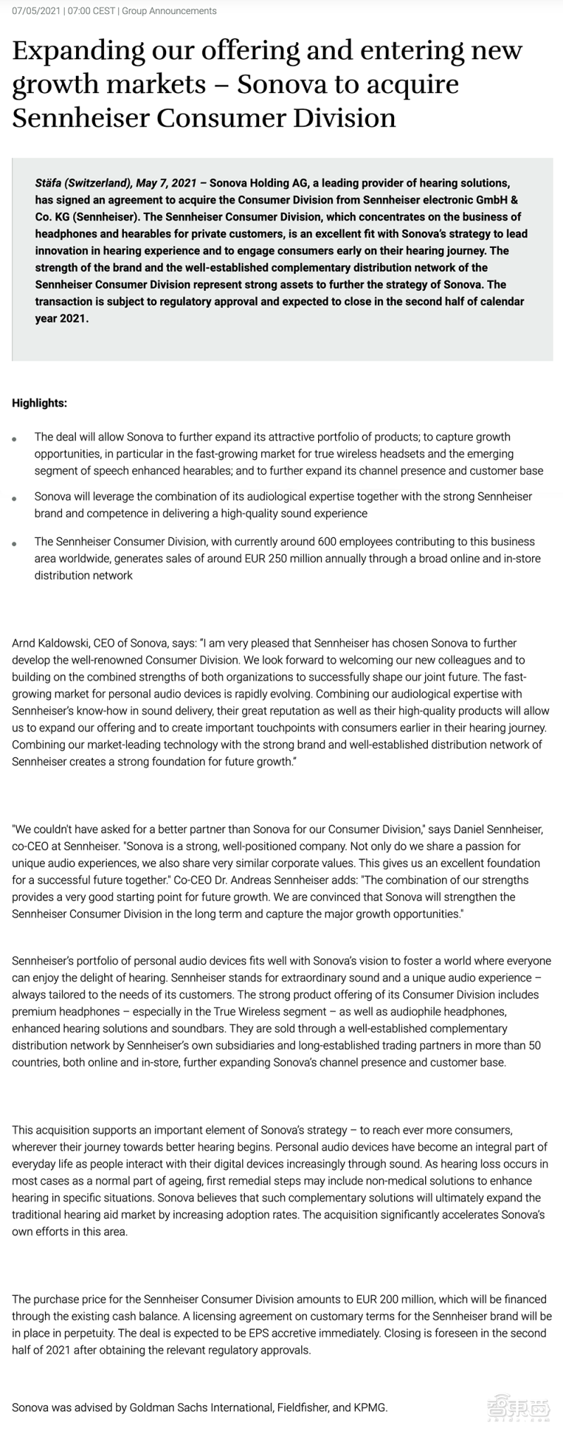 ▲Sonova 收购森海塞尔消费者业务部门官方声明