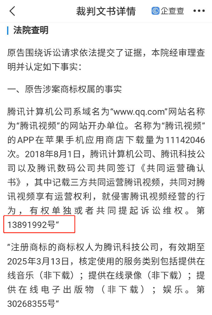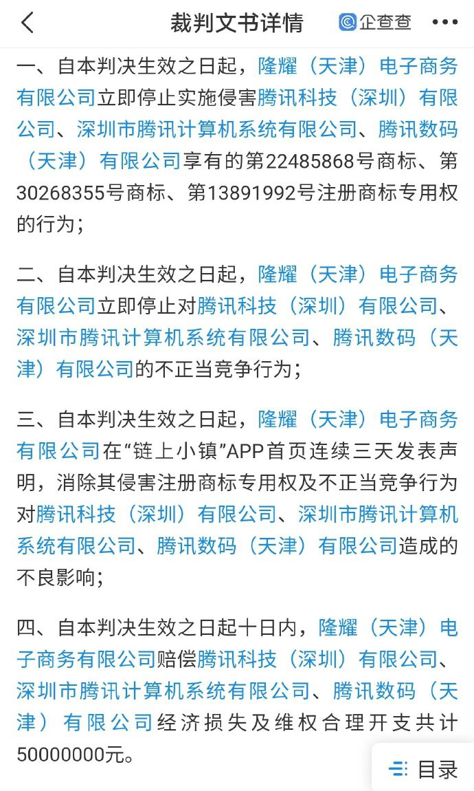 8 日消息 企查查 App 显示,近日,隆耀(天津)电子商务有限公司因在其“链上小镇”App 上使用“腾讯视频”相关商标被法院认定侵权,同时法院查明该平台还存在盗播腾讯视频电视剧行为。企查查显示,法院一审判决该公司停止侵害腾讯享有的“腾讯视频”相关商标及停止不正当竞争行为,赔偿腾讯 5000 万元人民币。
