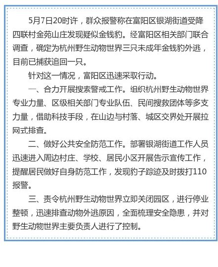 上一篇:杭州野生动物世界第二只外逃豹子找到