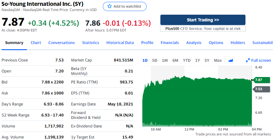 常规交易中新氧涨 0.34 美元,涨幅为 4.52%,报收于 7.87 美元。