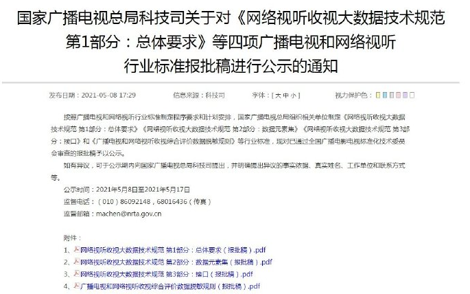 12 日消息 近日,广电总局公布了“国家广播电视总局科技司关于对《网络视听收视大数据技术规范第 1 部分:总体要求》等四项广播电视和网络视听行业标准报批稿进行公示的通知”。