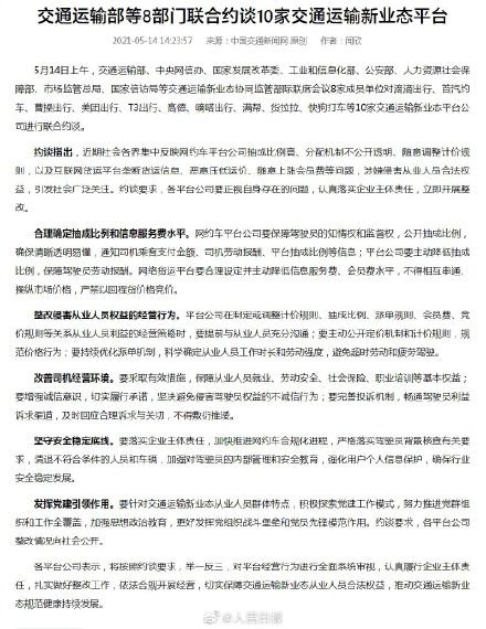 5月14日上午,交通运输部等8部门对滴滴出行、首汽约车、曹操出行、美团出行、T3出行、高德、嘀嗒出行、满帮、货拉拉、快狗打车等10家交通运输新业态平台公司进行联合约谈。