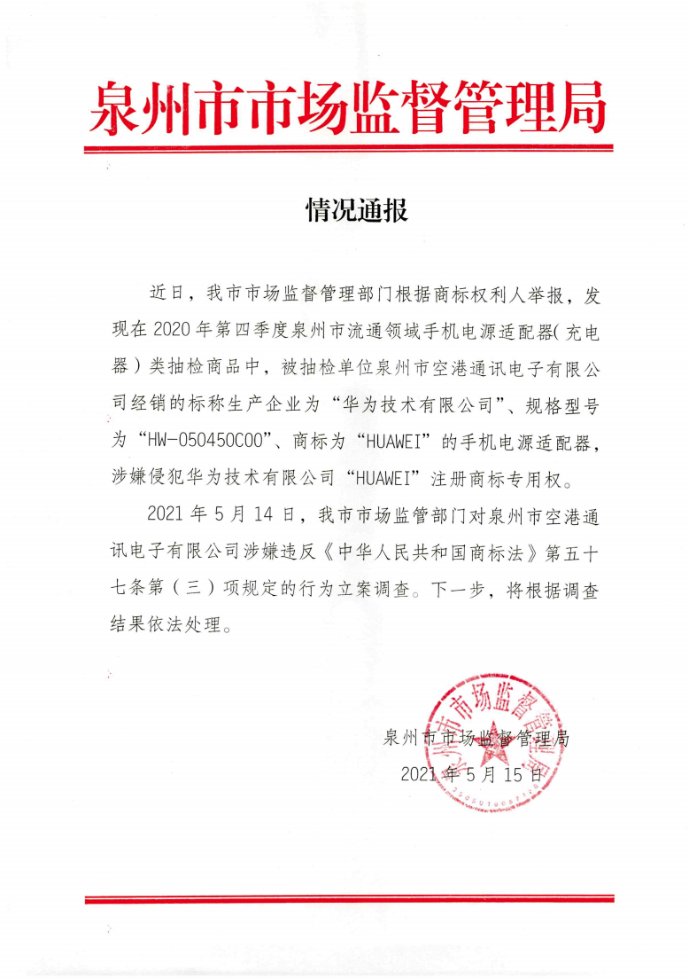 近日,我市市场监督管理部门根据商标权利人举报,发现在 2020 年第四季度泉州市流通领域手机电源适配器(充电器)类抽检商品中,被抽检单位泉州市空港通讯电子有限公司经销的标称生产企业为“华为技术有限公司”、规格型号为“HW-050450C00”、商标为“HUAWEI”的手机电源适配器,涉嫌侵犯华为技术有限公司“HUAWEI”注册商标专用权。