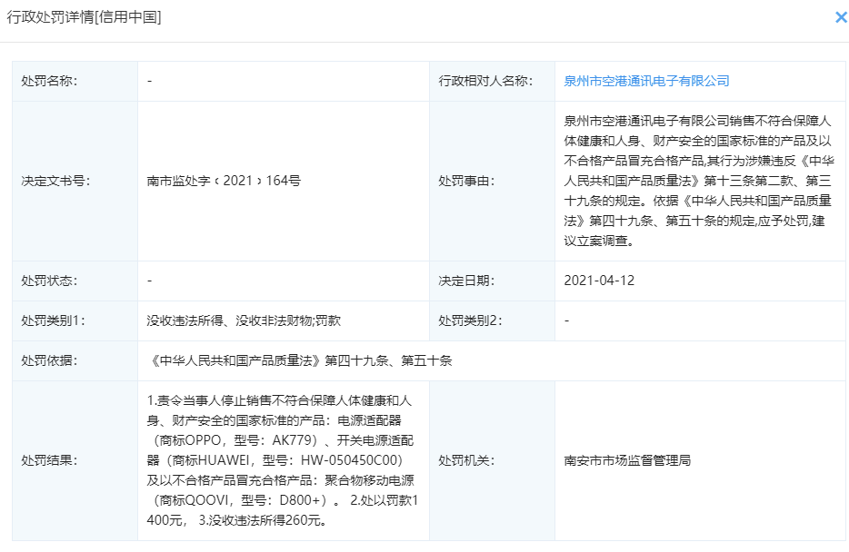 并且该公司不止销售华为的充电器,还销售 OPPO,QOOVI(酷唯)等品牌产品,属于惯犯。值得一提,南京市市场监管总局曾责令该企业停售假冒的 OPPO 充电器并处以罚款 1400 元。
