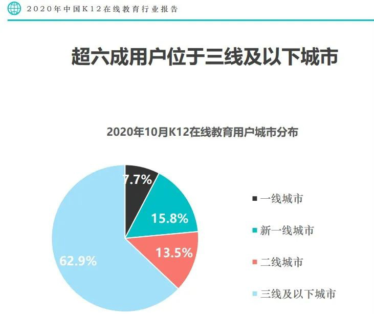 根据《2020 年中国 K12 在线教育行业报告》,超六成用户位于三线及以下城市(占比最高);在新增用户中,三线以下城市竟占比近八成,这强烈预示着 K12 下沉市场是“兵家必争之地”。