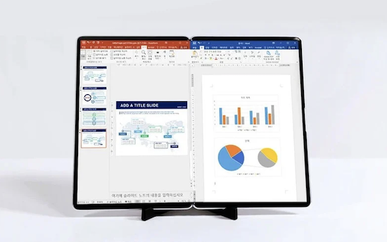 通过演示发现,目前折叠屏手机采用的两面内折设计,很可能并不是智能手机的未来方向。反而,这一设计很可能会在未来的笔记本电脑、平板电脑中进行使用,例如可达 17 英寸的便携折叠显示器,或是上下皆为屏幕的笔记本电脑。