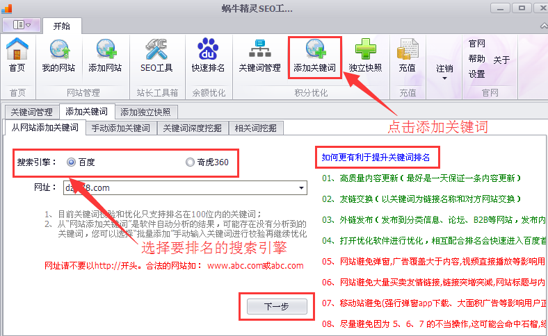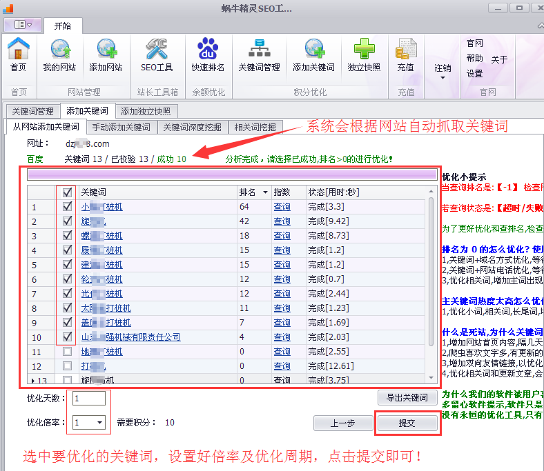 蜗牛精灵优化软件一键诊断网站的搜索引擎优化状态,在最短的时间内进行最高效的搜索引擎优化操作,并根据网站的不同阶段进行不同的搜索引擎优化操作方法,使网站能够快速提升百度排名和网站权重;蜗牛向导优化软件更加智能化,可以优化网站首页或内页的关键词排名;百度优化可以针对第三方网站如新闻源和B2B平台进行;手机排名和其他搜索引擎排名可以优化。