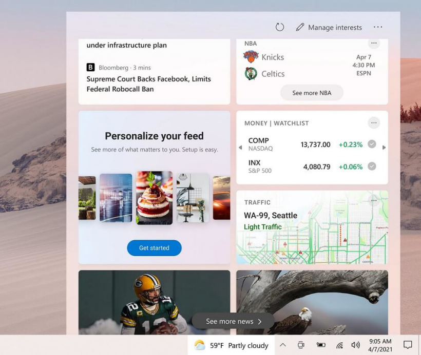 “新闻和兴趣”将使用户能够随时了解用户所在地区的最新天气状况。用户可以将鼠标悬停在天气图标上,查看关于天气的其他细节。除了天气之外,用户还可以查看新闻、体育、股票和交通,用户还可以保存新闻或与他人分享。