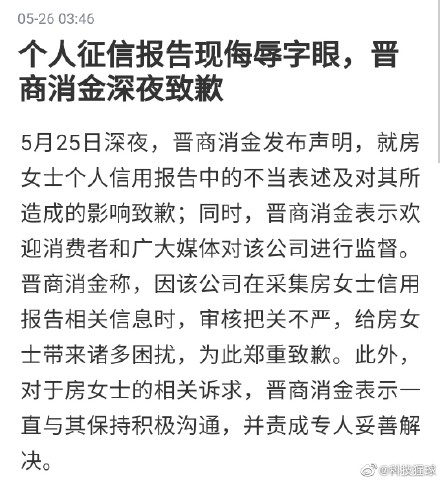 5月25日深夜,晋商消金发布声明,就房女士个人信用报告中的不当表述及对其所造成的影响致歉;同时,晋商消金表示欢迎消费者和广大媒体对该公司进行监督。晋商消金称,因该公司在采集房女士信用报告相关信息时,审核把关不严,给房女士带来诸多困扰,为此郑重致歉。此外,对于房女士的相关诉求,晋商消金表示一直与其保持积极沟通,并责成专人妥善解决。