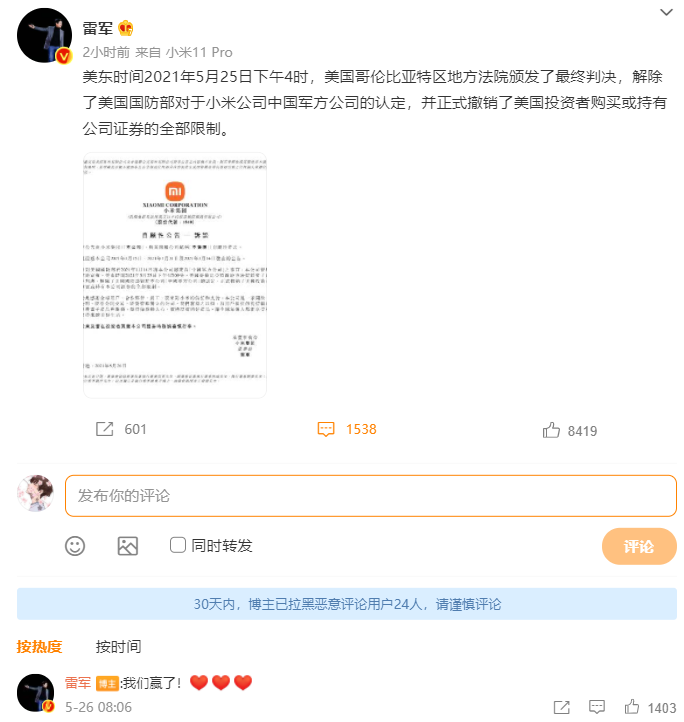 同时,小米创办人、董事长兼 CEO 也通过社交媒体公布了这一消息,并表示“我们赢了”。