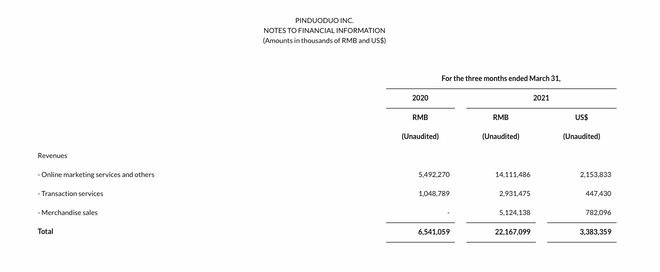 财报数据显示,一季度拼多多总收入为人民币 221.671 亿元 (33.834 亿美元),去年同季度总收入为 65.411 亿元。拼多多表示,该增长主要是由于在线营销服务收入增加以及商品销售的贡献所致。