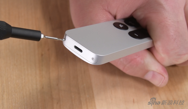 这一代的遥控器叫 Siri Remote,完全重新设计,电池位于下半部分,电路则占据上半部分。要拆开它,必须从遥控器底部的面板上卸下两个螺钉,之后取下按键,并将其他部分从金属外壳里抽出。