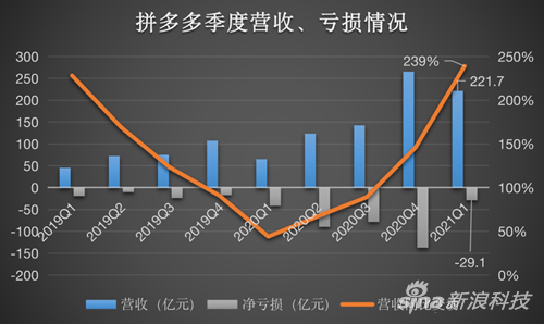 财报显示,2021 年第一季度,拼多多总营收 221.671 亿元(约 33.834 亿美元),同比增长 239%。归属于拼多多普通股股东的净亏损为 29.054 亿元(约合 4.435 亿美元),而上年同期净亏损 41.193 亿元。不按美国通用会计准则,归属于拼多多普通股股东的净亏损为 18.93 亿元,而上年同期净亏损 31.696 亿元。