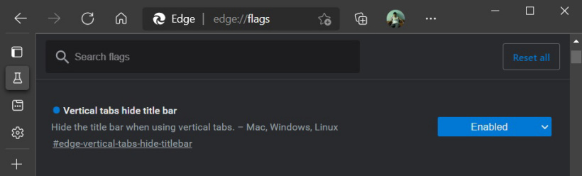 这是一项实验功能,用户需在 edge://flags 中搜索 Vertical tabs hide title bar,然后将其设置为 Enabled。