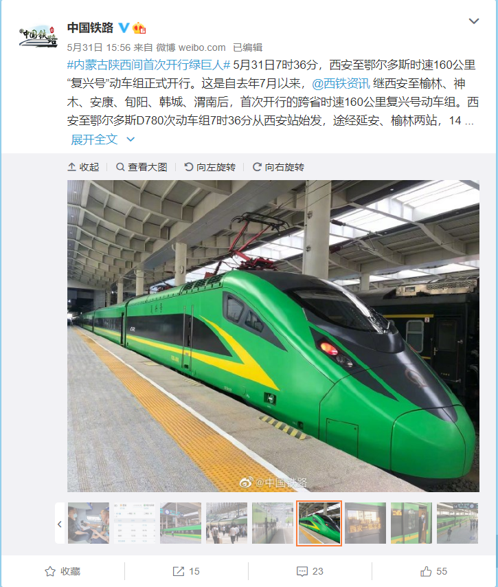 1 日消息 据中国铁路发布,5 月 31 日早晨 7 时 36 分,西安至鄂尔多斯 D780 次列车从西安火车站缓缓驶出,标志着西安至鄂尔多斯时速 160 公里“复兴号”动车组正式开行。