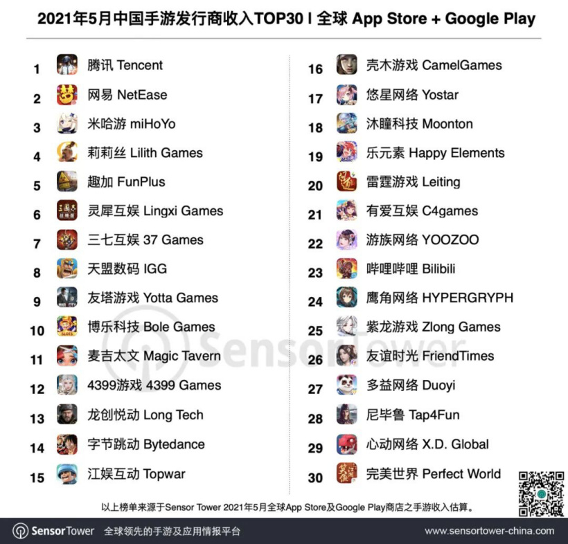 数据显示,本期排行中,米哈游重回收入榜第三,字节跳动游戏收入达到 4 月的两倍创历史新高,首次跻身榜单第 14 名。