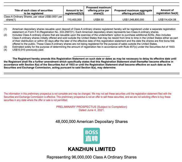 招股书显示,公司预计将公开发行 4800 万股美国存托股份(ADS),价格区间为每股 ADS 17-19 美元,募资约 10 亿美元,估值超过 80 亿美元。依照惯例,BOSS 直聘还赋予 IPO 承销商最多 720 万股 ADS 超额配售权。