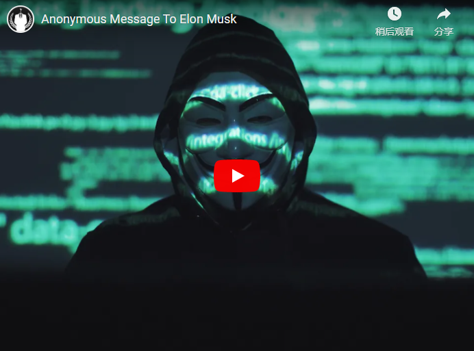 在这段视频中,一个头戴面具、经过变声处理的人自称代表“匿名者”,一开场就喊出:“向世界所有公民问候,这是匿名者送给埃隆?马斯克的信。”