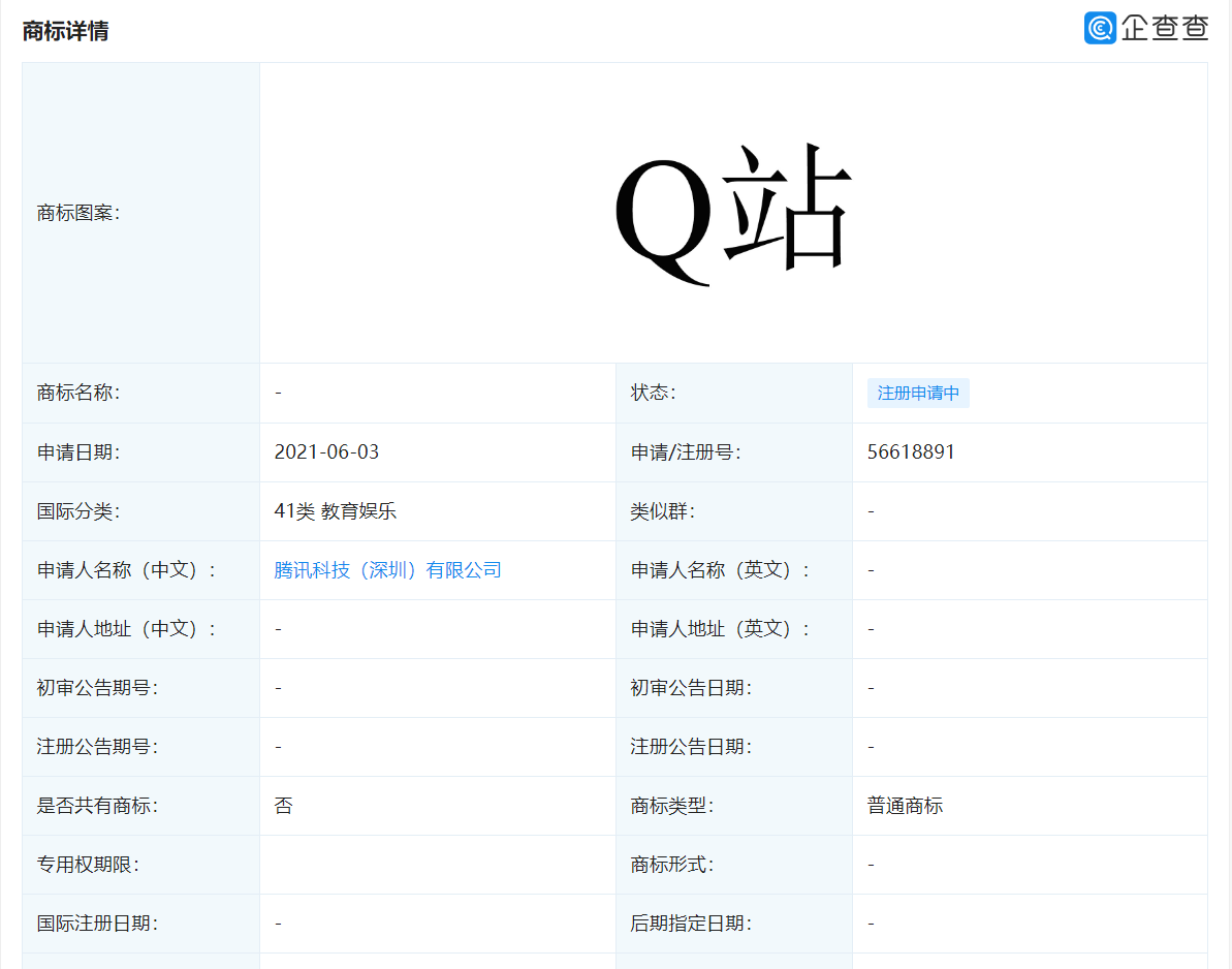 QQ 的广泛使用,也使字母“Q”时常会与腾讯联系起来。企查查 App 显示,近日,腾讯科技(深圳)有限公司申请注册“Q 站”商标,国际分类涉及网站服务、教育娱乐、广告销售等,目前商标状态为注册申请中。