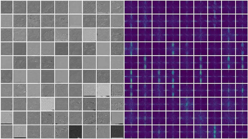 ▲从 100 个生成模型中每一个生成的图像在左边产生一个估计的指纹,在右边产生一个相应的频谱。许多频谱显示出不同的高频信号,而有些频谱看起来彼此相似。
