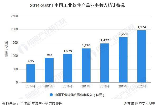 据工信部统计数据显示,2019 年我国工业软件产品收入 1720 亿元,同比增长 14.6%;2020 年,我国工业软件产品收入达到 1974 亿元,同比增长 11.2%;2020 年,全国软件和信息技术服务业规模以上企业累计完成软件业务收入 81616 亿元,工业软件产品收入占比为 2.42%。