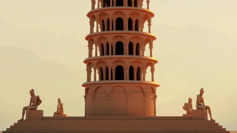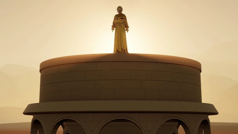 这是一场举办在金色「沙漠」中的时装秀,模特缓缓从塔顶走下,身上的时装闪烁着金属般的光芒。与其他时装秀不同的是,这里没有高举相机的摄影师,也没有聚精会神看秀的观众。