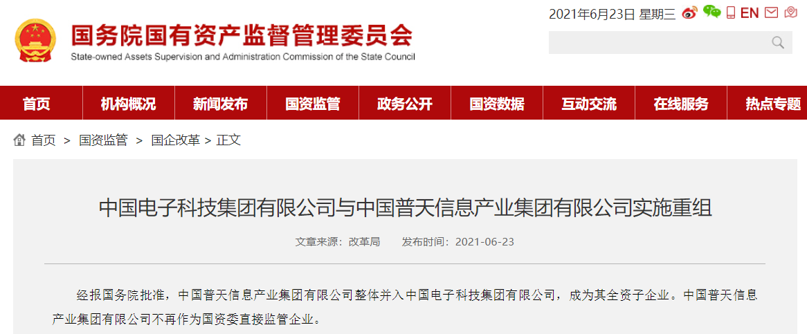 23 日消息 据国资委网站,经报国务院批准,中国普天信息产业集团有限公司整体并入中国电子科技集团有限公司,成为其全资子企业。中国普天信息产业集团有限公司不再作为国资委直接监管企业。