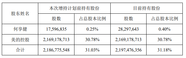 本次增持后,何享健持有公司股份 2829.76 万股,占公司总股本的 0.40%。截至目前,已完成增持计划最低金额。
