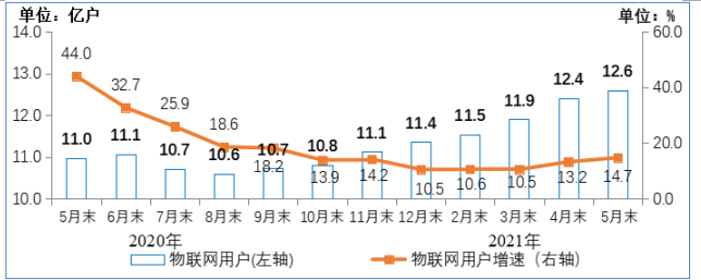 24 日消息 近日,工信部发布了《2021 年 1-5 月通信业经济运行情况》,报告称,今年前五月我国蜂窝物联网用户规模持续扩大,截至 5 月末,三家基础电信企业发展蜂窝物联网终端用户 12.58 亿户,比上年末净增 1.22 亿户。