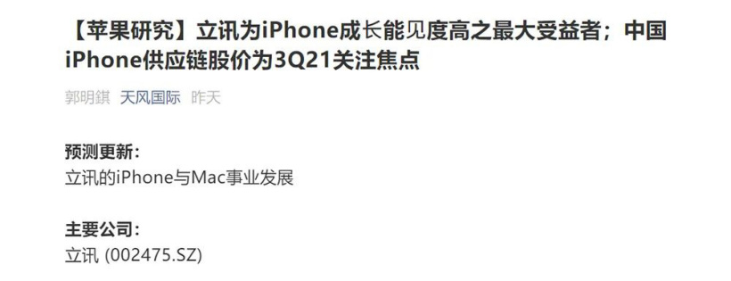 昨晚天风证券“苹果分析师”郭明錤又给出一份报告,称大陆企业立讯精密将成为后续 iPhone 强劲增长的“最大受益者”,或成为仅次于富士康的全球第二大 iPhone 代工企业,超越和硕。