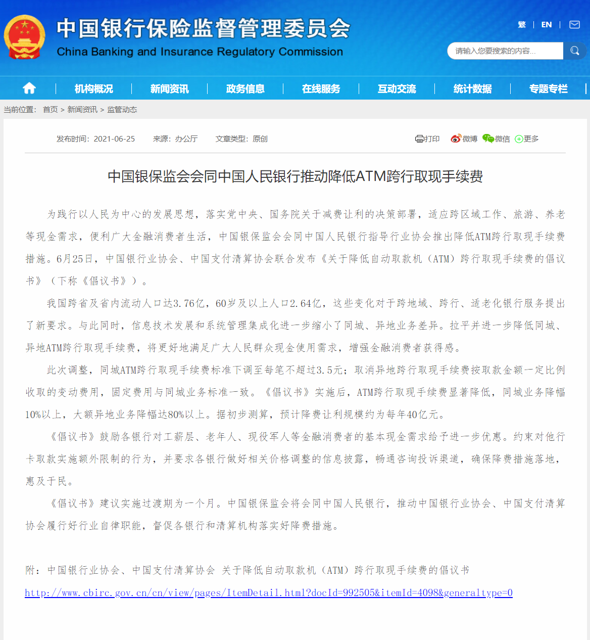 根据中国银行业协会、中国支付清算协会联合发布的倡议书,同城 ATM 跨行取现手续费标准下调至每笔不超过 3.5 元;取消异地跨行取现手续费按取款金额一定比例收取的变动费用,固定费用与同城业务标准一致。