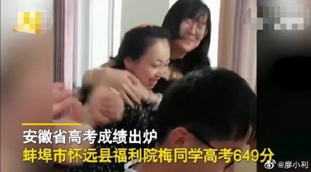 6月23日,安徽蚌埠。考生梅同学查到自己取得649的高分,福利院的阿姨们激动落泪。