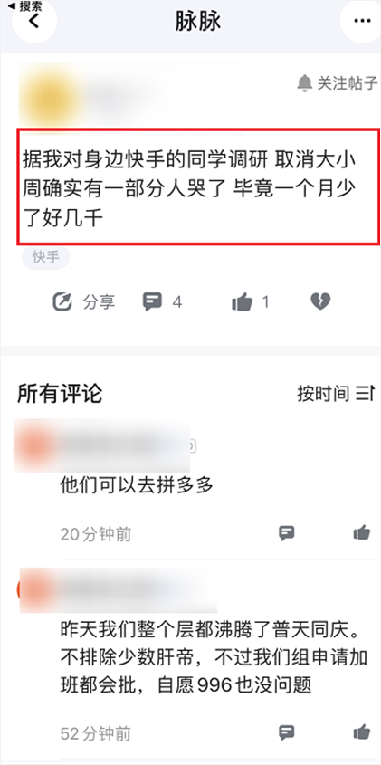 照理来说,现在取消大小周回归正常,员工该开心才是。但打开脉脉,发现竟然有不少人不愿意取消大小周。因为快手这一波操作,让他们的工资变少了……