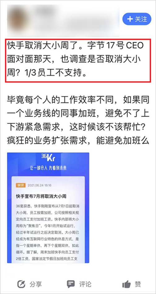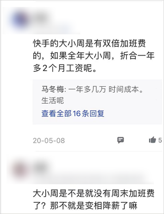 还有人觉得快手这是“不安好心”,取消大小周,是要开始“白嫖”大家的加班了。