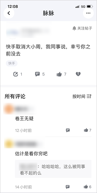 甚至,还有其他 996 大厂的员工跳出来表示,幸亏自己当初没去快手。(卷王不在乎加班,只在乎钱多不多)