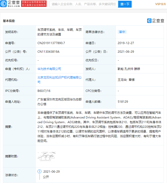 1 日消息 华为在近日公开了“车顶调节系统、车体、车辆、车顶的调节方法及装置”专利,公开号为 CN113043819A。