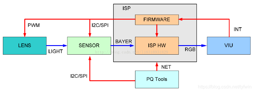 根据魅族内核团队《相机系统综述》一文所述,用户在拍摄景物时,景物通过 Lens(镜头)生成光学图像,然后投影到 Image Sensor(图像传感器)上,经过光电转换、A/D 转换生成 Bayer 格式的原始数字图像,然后输出到 ISP(图像信号处理器),经过算法处理,最后输出用户可见的图像。