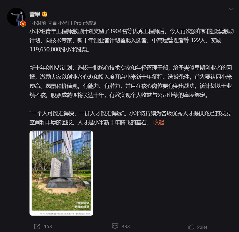 今日,小米创始人雷军宣布,小米继青年工程师激励计划后,今天再次颁布新的股票激励计划 ——“新十年创业者计划”,向技术专家、新十年创业者计划首批入选者、中高层核心管理者等 122 人,奖励 119,650,000 股小米股票(按照昨日收市的 25.950 港元计算,总计超 31 亿港元)。