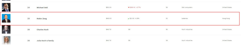 随着市值的增长,宁德时代创始人兼董事长曾毓群的身价也水涨船高。福布斯富豪榜的实时榜单显示,宁德时代董事长曾毓群身价达到 479 亿美元(约合 3099 亿元人民币),位列全球第 25 位,中国第三位,排名落后于农夫山泉创始人钟睒睒和腾讯创始人马化腾,后两人分列全球榜单的第 15 位和 23 位。值得一提的是,曾毓群的身价也首次超过了排名第 29 位的阿里巴巴创始人马云,马云目前的身价为 461 亿美元(约合 2983 亿元人民币)。